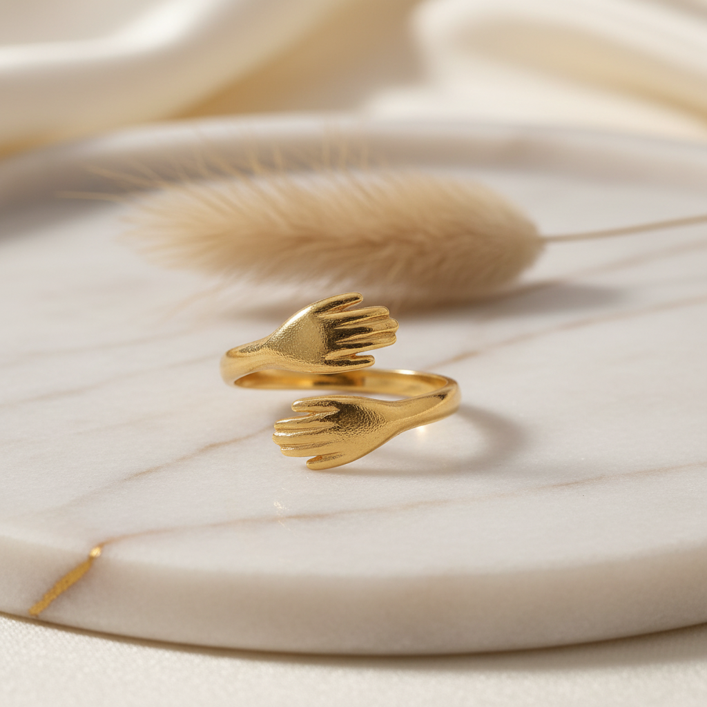 This hug ring features a softly curved, open-ended silhouette, designed for women who love elegance with emotional warmth. Minimal yet meaningful, it wraps the finger like a quiet embrace.